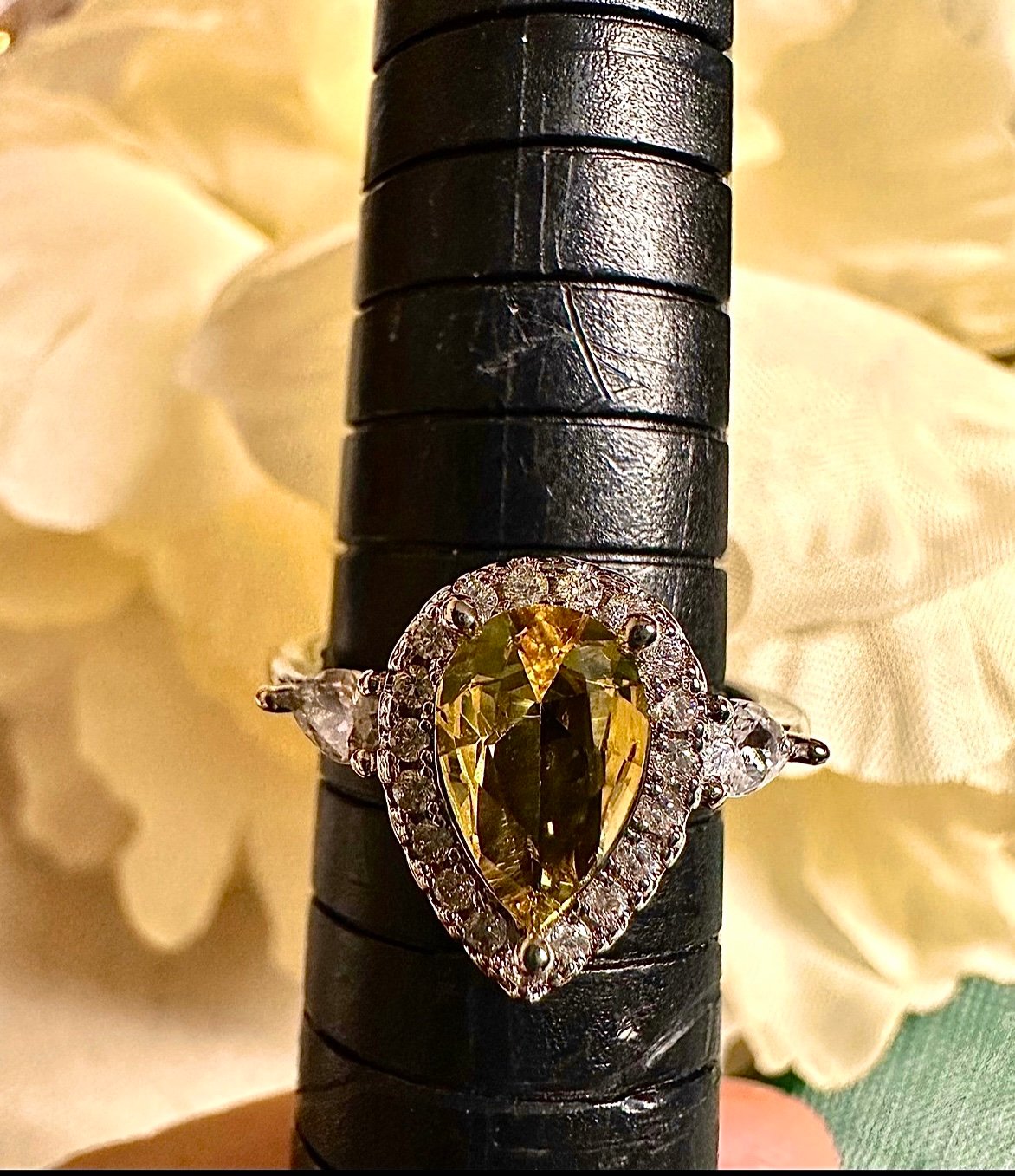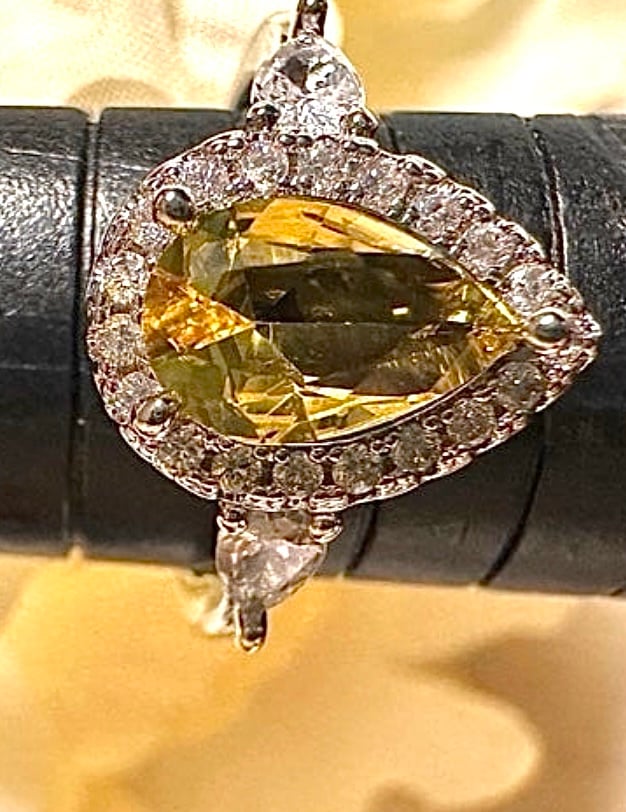 1/2 carat clear halo and two smaller pear side simulated diamonds