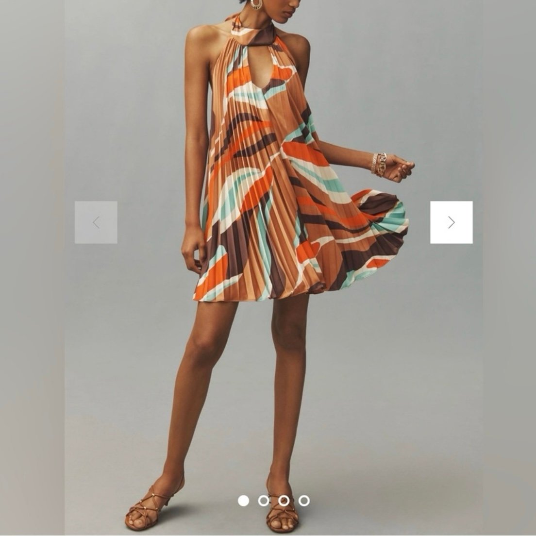 The Anthropologie Hutch Halter Pleated Swing Mini Dress in size XX-Small is a stylish and colorful piece perfect for women who love a bohemian look. This sleeveless dress features a geometric pattern with pleated accents, a halter neckline, and a tie closure. Made from a blend of polyester and spandex, the satin fabric is lightweight and lined for comfort. The short dress length adds a whimsical touch to the overall design, making it a versatile choice for various occasions.