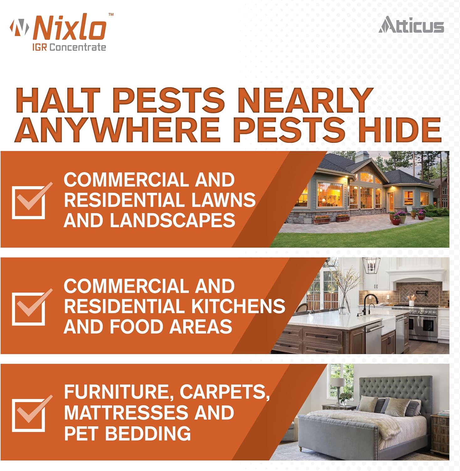 Talak 7.9% F provides lasting protection from damaging insects found in landscapes, ornamentals, business and residential turf, recreational areas and more. It targets over 75 pests including termites, fire ants, fleas, and ticks. This product uses the active ingredient bifenthrin to give pest control professionals the support they need in their battle against insect damage. Nixlo IGR Concentrate contains pyriproxyfen, a product known to disrupt the life cycles of more than 50 pests, including: fleas, cockroaches, mosquitoes, flies, and Lone Star ticks. It is a versatile product that is effective both indoors and outdoors. This non-repellent IGR mimics the Juvenile Hormone of insects, preventing the successful development of immature insects into adults. When used in combination with a non-IGR insecticide like Talak, it eradicates adult insects and deposits a long-lasting residual effect of up to seven months. Nixlo IGR Concentrate actively disrupts the development of immature insects and helps prevent resistance. By incorporating Nixlo IGR Concentrate into an Integrated Pest Management program, you can break the reproductive cycle of insects and stop future infestations.