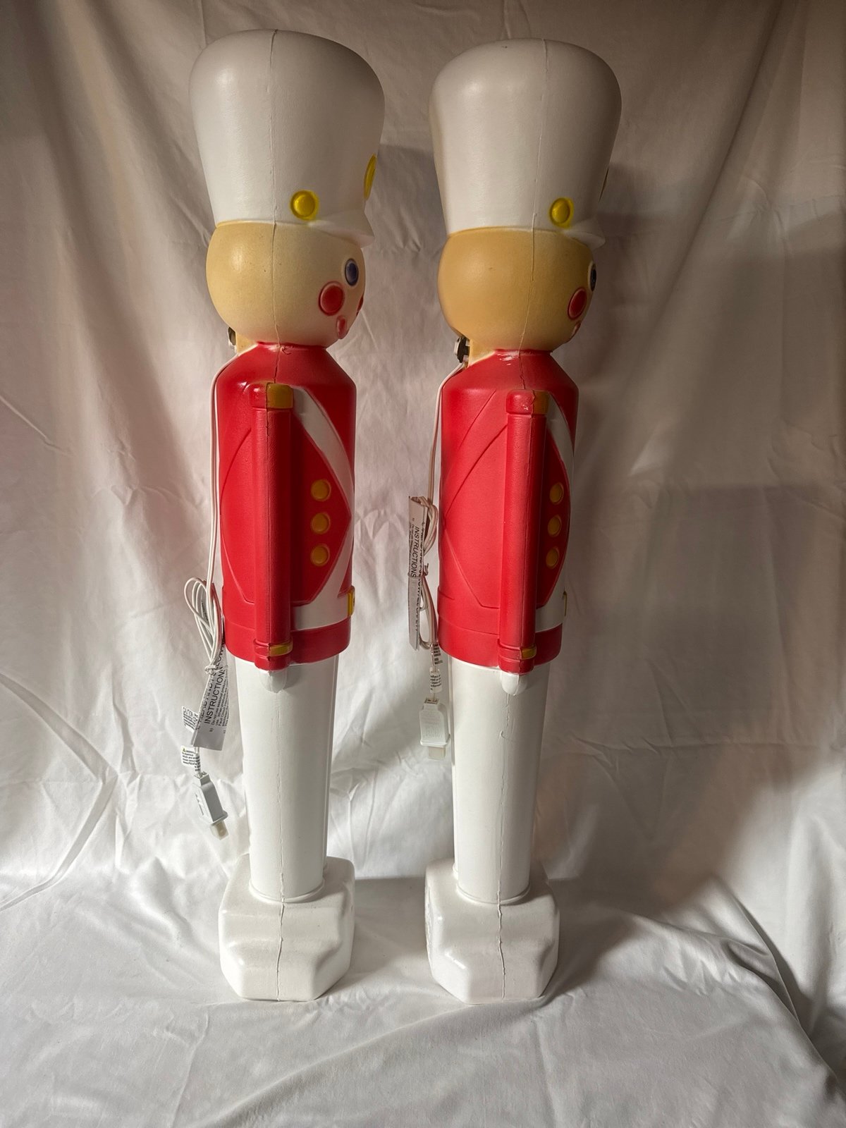 The product is a set of 2 vintage General Foam 31" blow mold lighted Toy Soldiers with white hats. These Toy Soldiers are part of the Toy Soldiers character family, specifically designed for holiday and seasonal décor in yards. Made in the USA, each soldier has a height of 31 inches and features a classic design that adds a nostalgic touch to holiday displays. Perfect for outdoor decorating, these lighted Toy Soldiers bring a festive and charming atmosphere to any home during the holiday season.