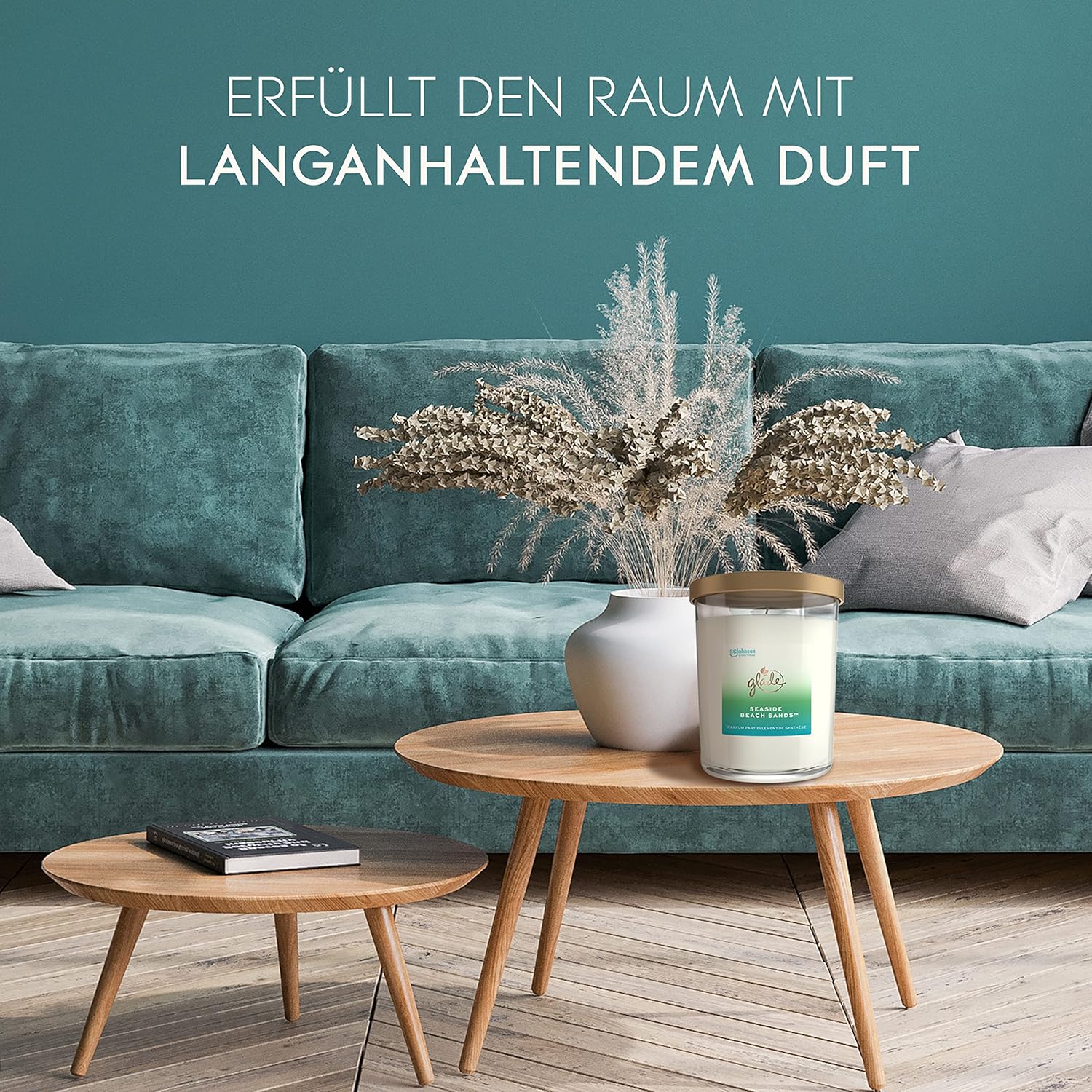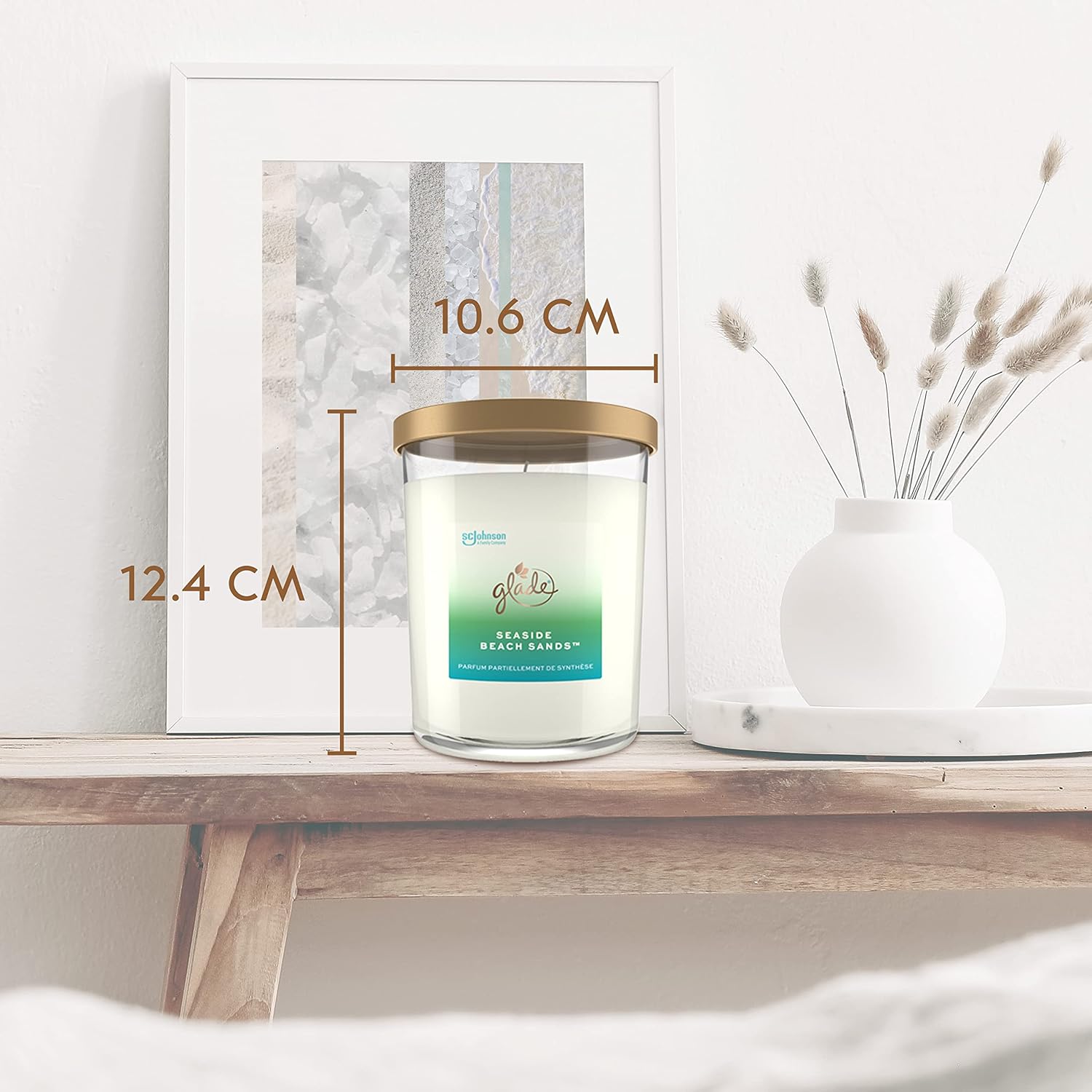 Get creative and create a calm mood with the scent of something very special: Seaside Beach Sands. It is an invigorating yet calm fragrance that is relaxing and reminiscent of a walk on a peaceful sea coast. In addition, this Glade scented candle in a glass complements the pleasant air freshener fragrance with a stylish and elegant design. The subtle, minimalist glass of this premium candle is made from white wax and an attractive rose gold lid. The candle blends into any decor and instantly adds a special flair to your home. It looks great, but only when you light it does it unfold its magical effect. The power of the fragrance fills the room for a long time and creates an unforgettable mood. All Glade scented candles are created by master perfumers. With the Glade Seaside Beach Sands Decorative Candles, you get crisp, salty and sandy notes that evoke images of the coast and are accompanied by a hint of floral blue lavender. The scent of this Glade candle is infused with essential oils and is elegant and luxurious, so you can quickly create a welcoming ambience. This pampering room fragrance has been created with high quality ingredients for an authentic experience. And when this modern candle is used up in the jar, the minimalist glass container can be used as a decorative element wherever you like. Our Glade scented candle with long burning time of up to 85 hours fills the room with authentic long-lasting fragrance. The Glade Seaside Beach Sands candles make an excellent gift idea. Gift these candles to someone special to share the elegant mood.