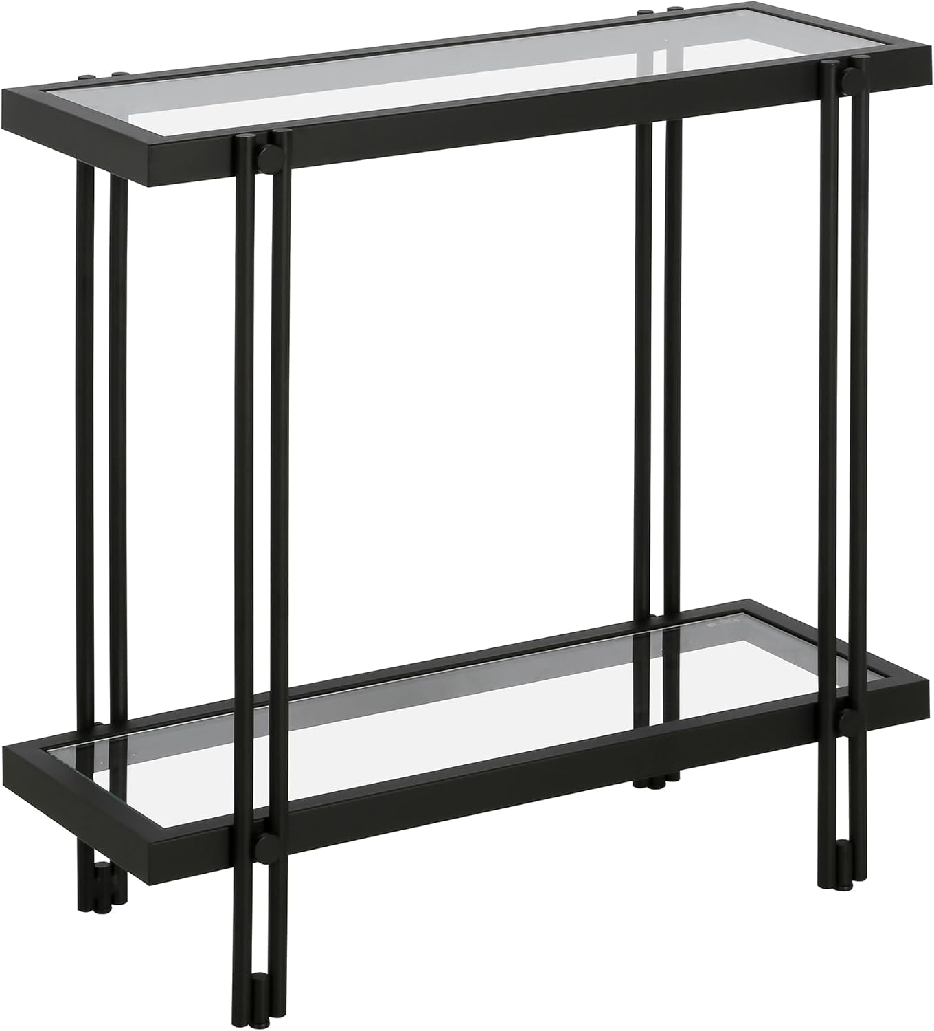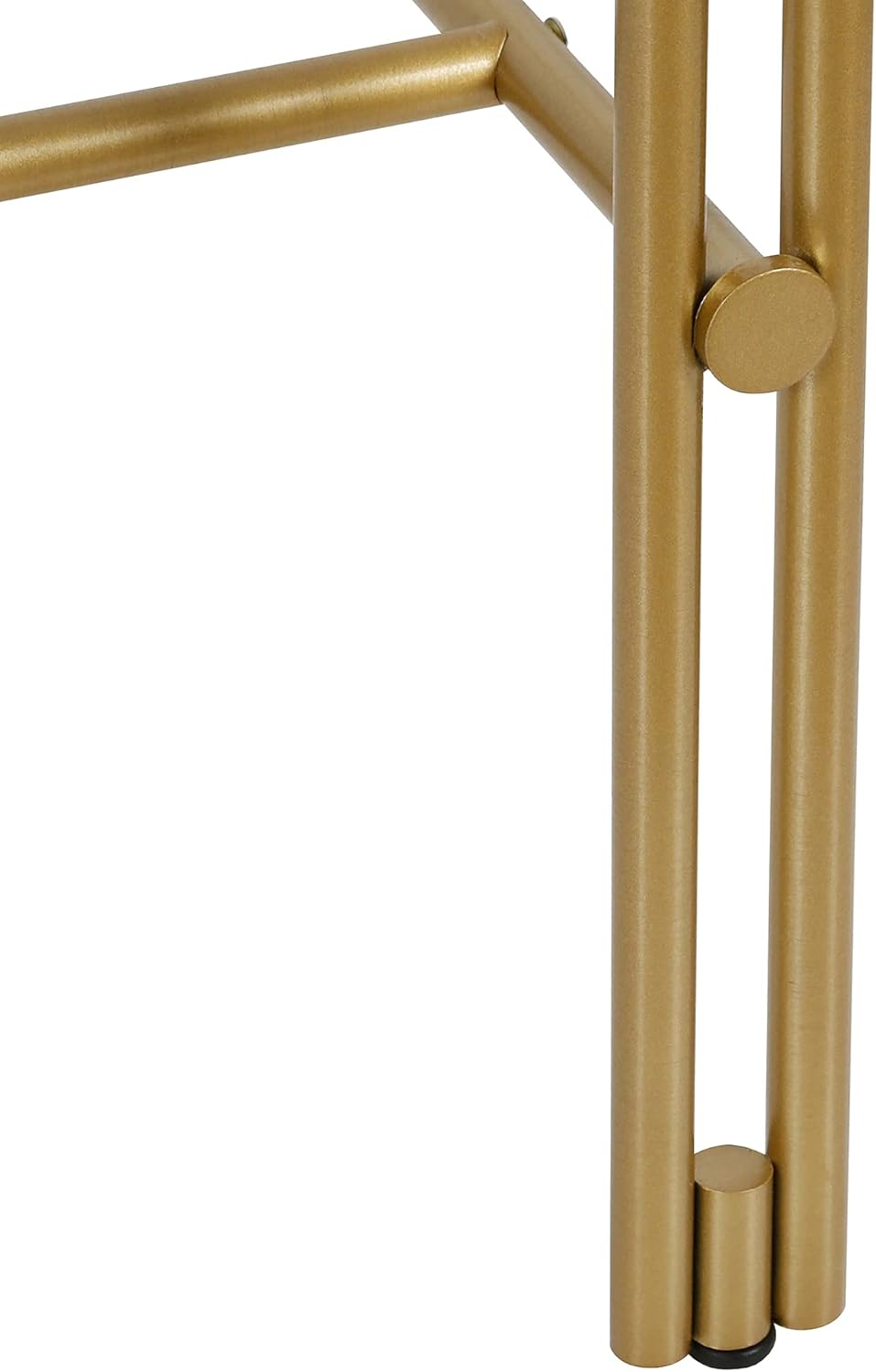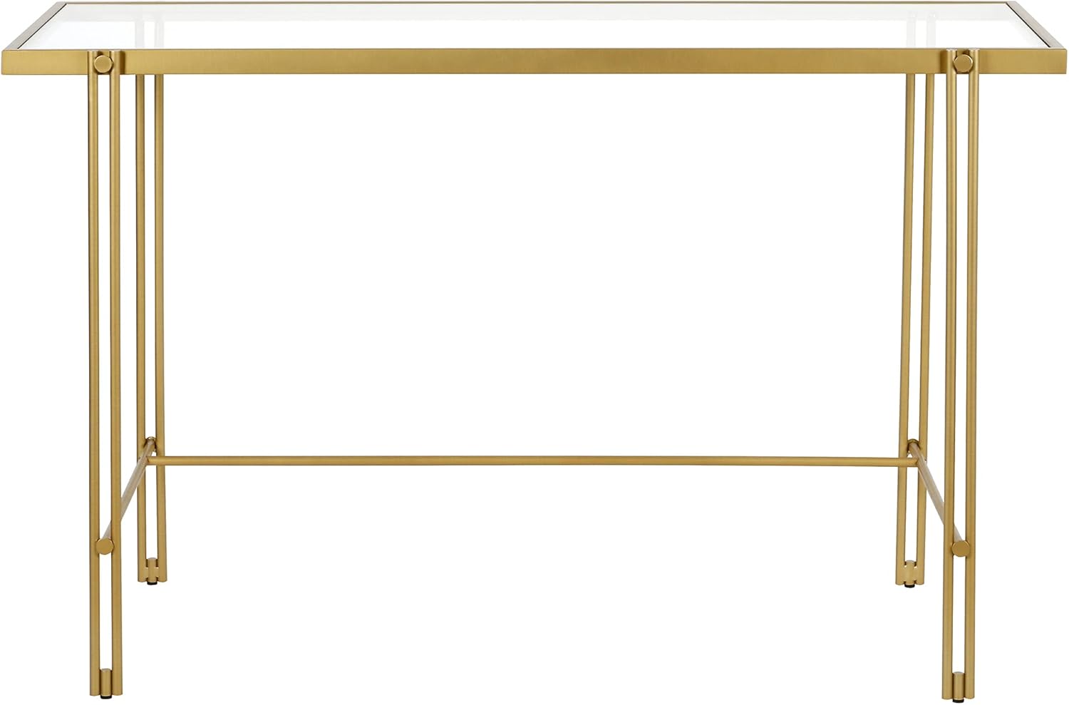 Work from home in style with the streamlined modern look of this contemporary desk. The sleek lines of its steel frame with a handcrafted brass finish are beautifully complemented by a sturdy tempered glass top, allowing you to personalize your workspace against a clean, transparent backdrop. The open lower space, anchored by a unique wraparound crossbar, provides plenty of room to settle in and take on the day. The 48-inch rectangular surface offers ample space for a computer, lamp, and writing essentials, and its chic silhouette is neutral enough to work in any space, from a home office to a living room.