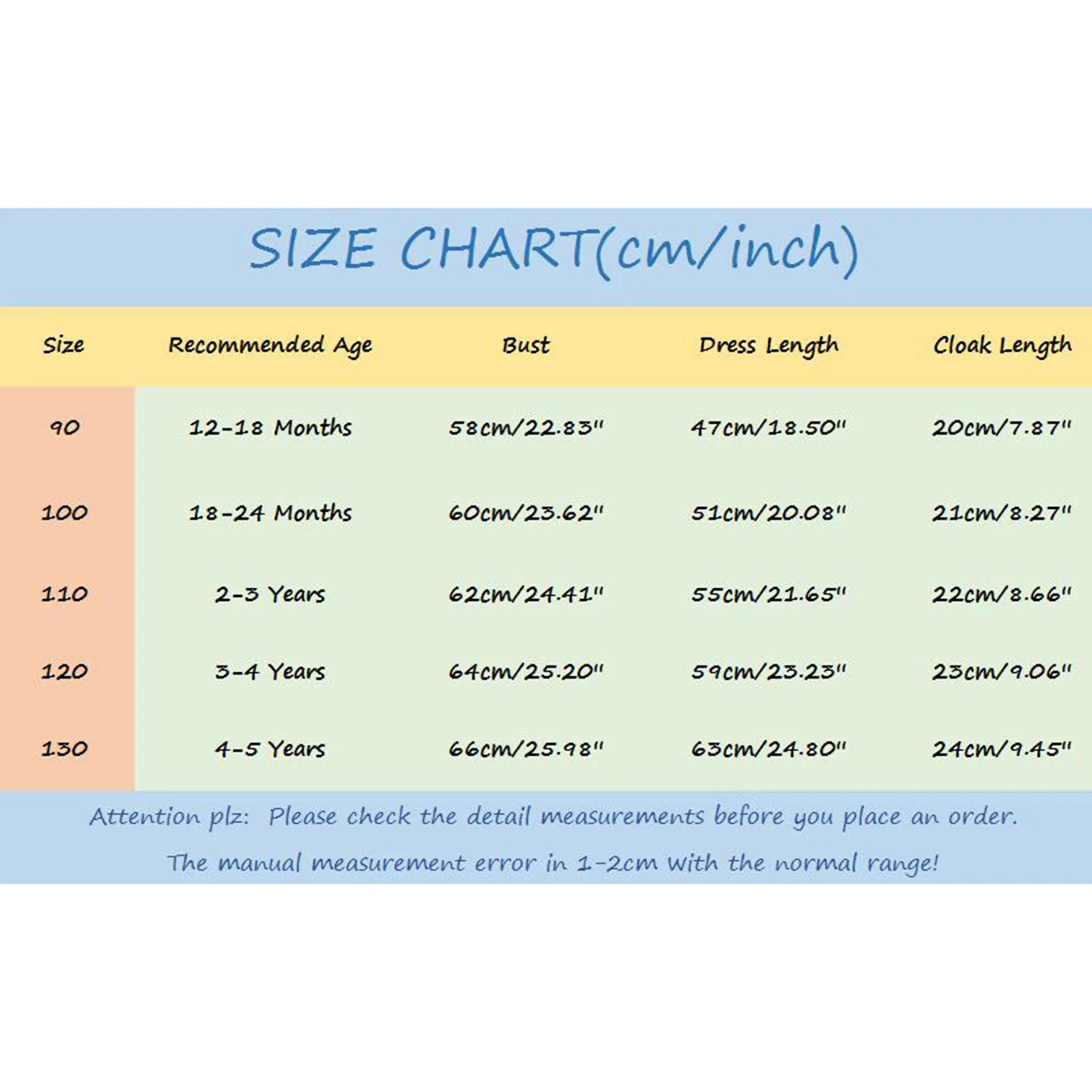 | Size:90 | Recommended Age:12-18 Months | Bust:58cm/22.83'' | Dress Length:47cm/18.50'' | Cloak Length:20cm/7.87'' |