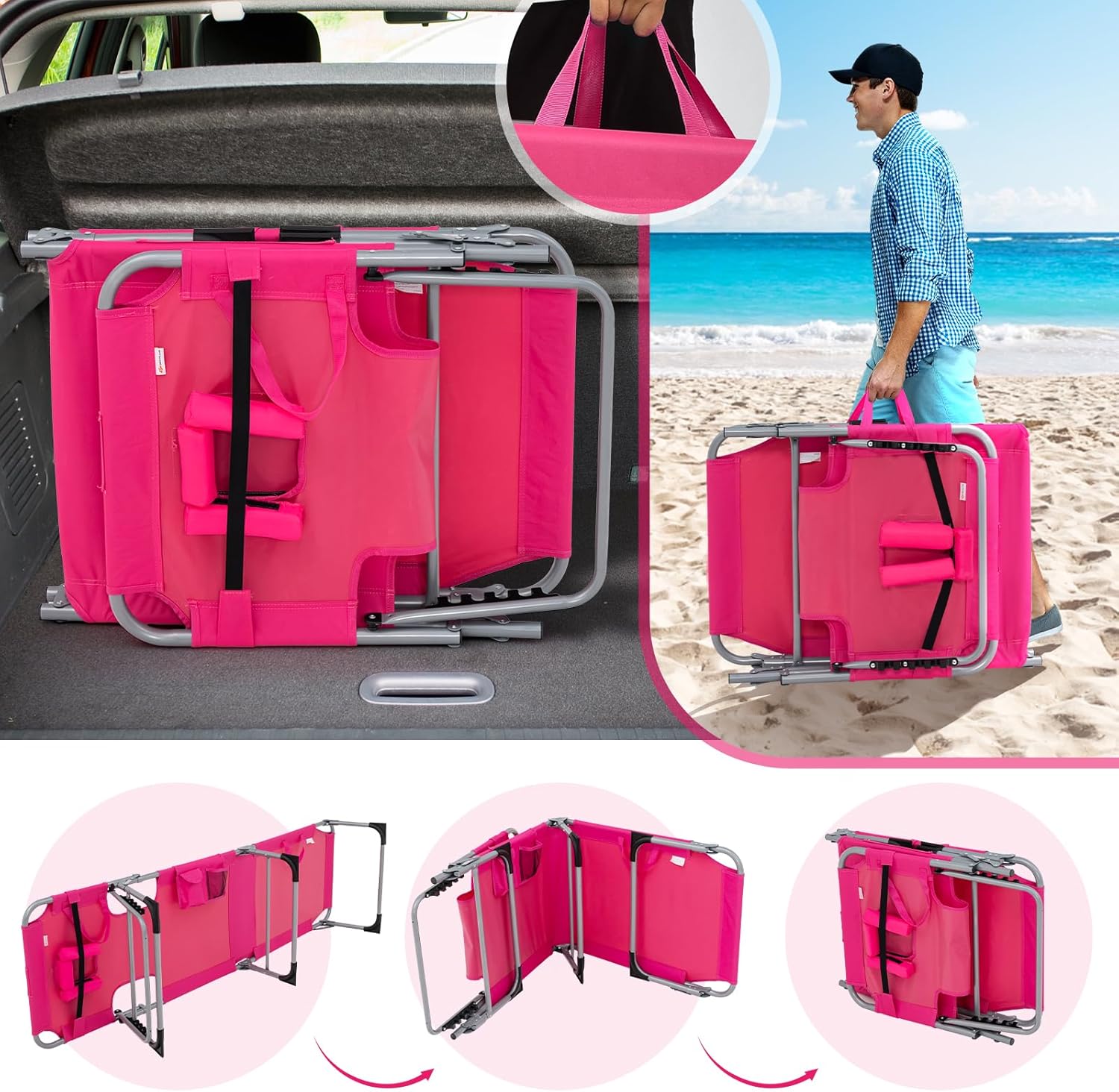 Description:Comfortable and portable folding lounge for ultimate relaxation anywhere.This lounge chair has 5 adjustable positions for your different activities and an open face hole to accommodate your face. Moreover, the lounge chair has 2 arm holes, allowing you to enjoy reading a book or watching your cell phone while lying on your stomach. The pillows are fluffy, adjustable, and removable to offer you ultimate comfort. This sun lounger is lightweight and foldable, so it's quite easy to carry. You can use it for patio, beach trips, camping, and other outdoor and indoor activities. Durable and stable, the folding tanning chair features high-quality fabrics and a sturdy steel frame to ensure long-term use.Enjoy your life with our folding chaise lounge!Features:Folding design to easily squeeze into a small corner in your houseAluminum and steel frame and premium oxford fabric for durability5 adjustable positions for a variety of activitiesEasy-grasping handles and light weight for easy transportRemovable pillow allows you to lie face upBreathing face hole and arm holes give you endless fun when you are lying face downNon-slip feet provide stability and 331 lbs weight capacityFree assembly and easy useSpecification:Color: Turquoise/Blue/Black/Grey/Pink/Blue StripeMaterial: Steel/ Aluminum Pipes, Sponge, Oxford FabricOverall Dimension: 68"-76" x 23.5" x 13.5"-30" (L x W x H)Folding Dimension: 32" x 23.5" x 7" (L x W x H)Pillow Dimension: 13" x 5" x 2.5" (L x W x H)Adjustable Backrest Height: 13.5" to 30"Adjustable Length: 68" to 76"Weight Capacity: 331 lbsNet Weight: 13 lbsPackage Includes:1 x Foldable Chaise Lounge1 x Instruction