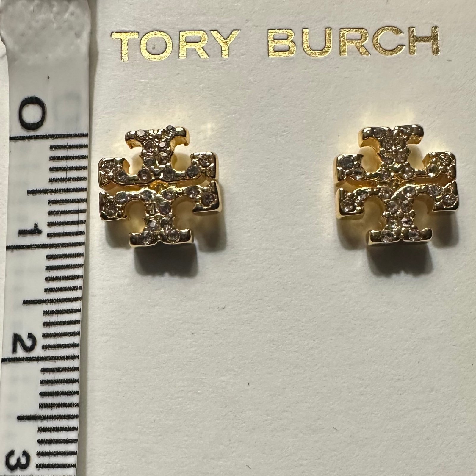 Elevate your style with these stunning Tory Burch Kira Crystal Logo Stud Earrings in Gold. Perfect for a Mother's Day gift, these authentic Tory Burch earrings feature a crystal main stone and a post closure for easy wear