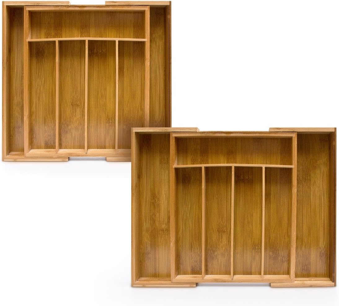 This cutlery tray will fit in absolutely any standard kitchen drawer, as the width is expandable with 2 telescoping outer compartments. When pushed together, there are 5 compartments with enough space for knives, forks, spoons, teaspoons and cake forks. If you pull the two sides of the tray out, there are 2 additional compartments for other kitchen utensils like whisks, wooden spoons, etc. This is the ideal silverware organiser for sorting kitchen accessories.This tray is made out of bamboo, raw material. The natural wood colour contrasts nicely with stainless steel cutlery or silverware, and it is moisture-resistant and ideal for use in the kitchen.Details on the Cutlery Tray• Total size pushed together: 5 x 31 x 37 cm• Size fully opened: approx 5 x 48.5 x 37 cm• Weight: approx 1.4 kg• Material: Bamboo, back wall made of MDF in bamboo look• Colour: Natural brownMulti-Purpose Bamboo Cutlery Holder for Kitchen Drawers• For cutlery, craft supplies, jewellery, etc.• 5, 6 or 7 compartments• Weather-proof and robust• Helps you keep your belongings orderly• Easy to cleanIncluded in Delivery• Bamboo cutlery tray• Decorative items shown in product pictures are not included