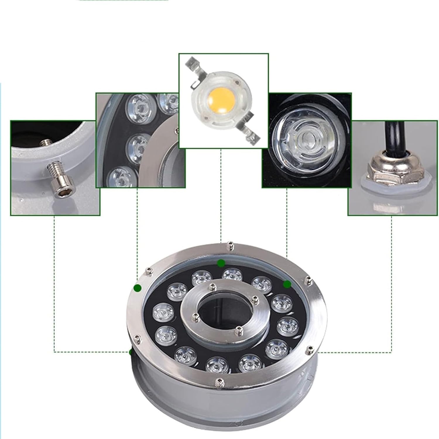 RGB Ring Fountain Underwater Light uses a fully immersed and perfectly sealed design, which can add dazzling colors to your pond or fountain and create an ideal atmosphere.Product Information:Name: LED fountain light/underwater light/Submersible LED Fountain LightVoltage:12/24vMaterial: Stainless steel 304 + tempered glass + PCPower: 6W, 9W, 12W, 18W, 24WProtection level: IP68Color: RGBFeatures:1.Underwater spotlight surface ring is made of polished and oxidized 304 stainless steel, which will not rust and discolor.2.Toughened glass lampshade, good light transmittance, and the luminous effect is very good.Shipping List:1 * LED Underwater Lights 1 * Remote controlCustomer Service- This product has passed the international implementation standards CIE, IEC, EMC (3C), can be used with confidence.If you have any questions about our products or orders, please contact us by email, and we will be happy to assist you and respond to you within 24 hours.